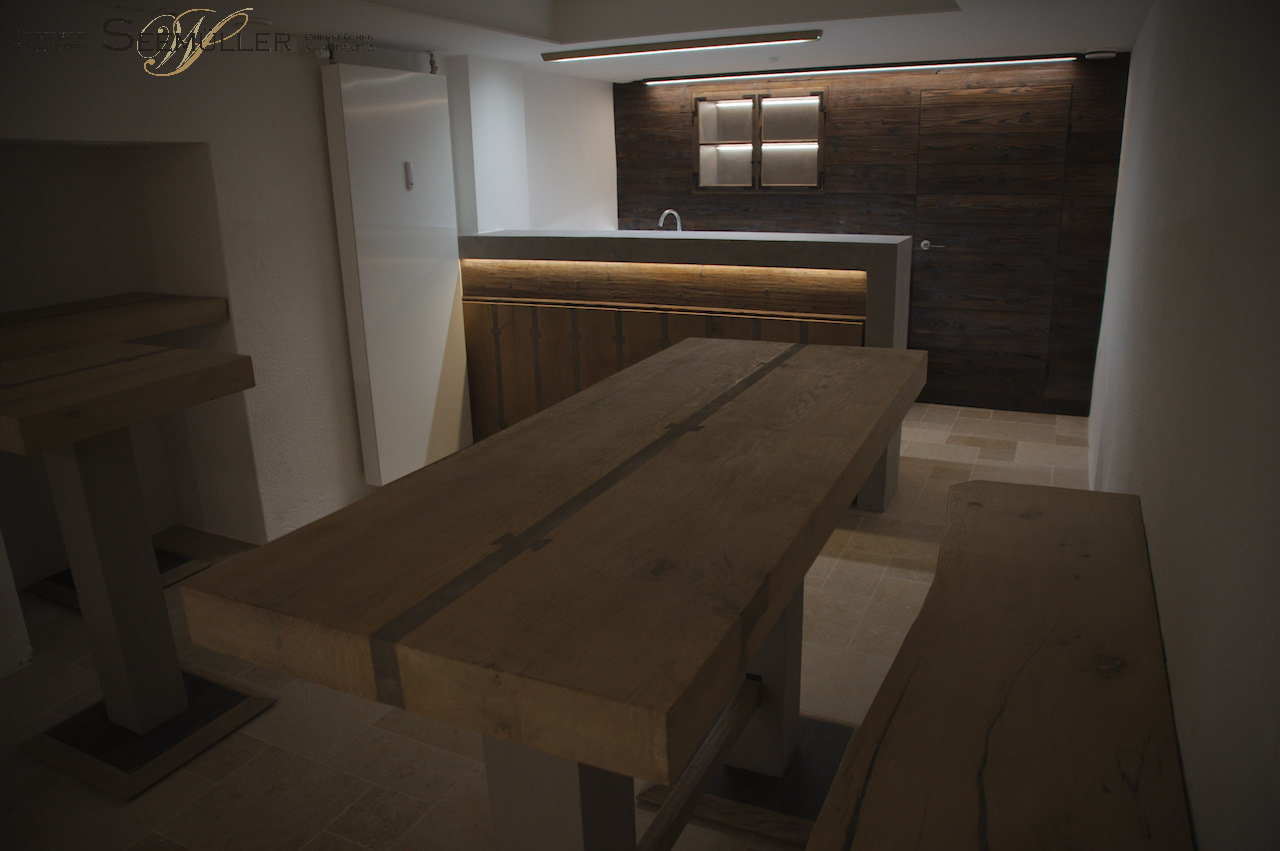 • Eichentafeln und rustikale Bänke aus gebürsteter Eiche, gekalkt mit AurinasBeton Einlage