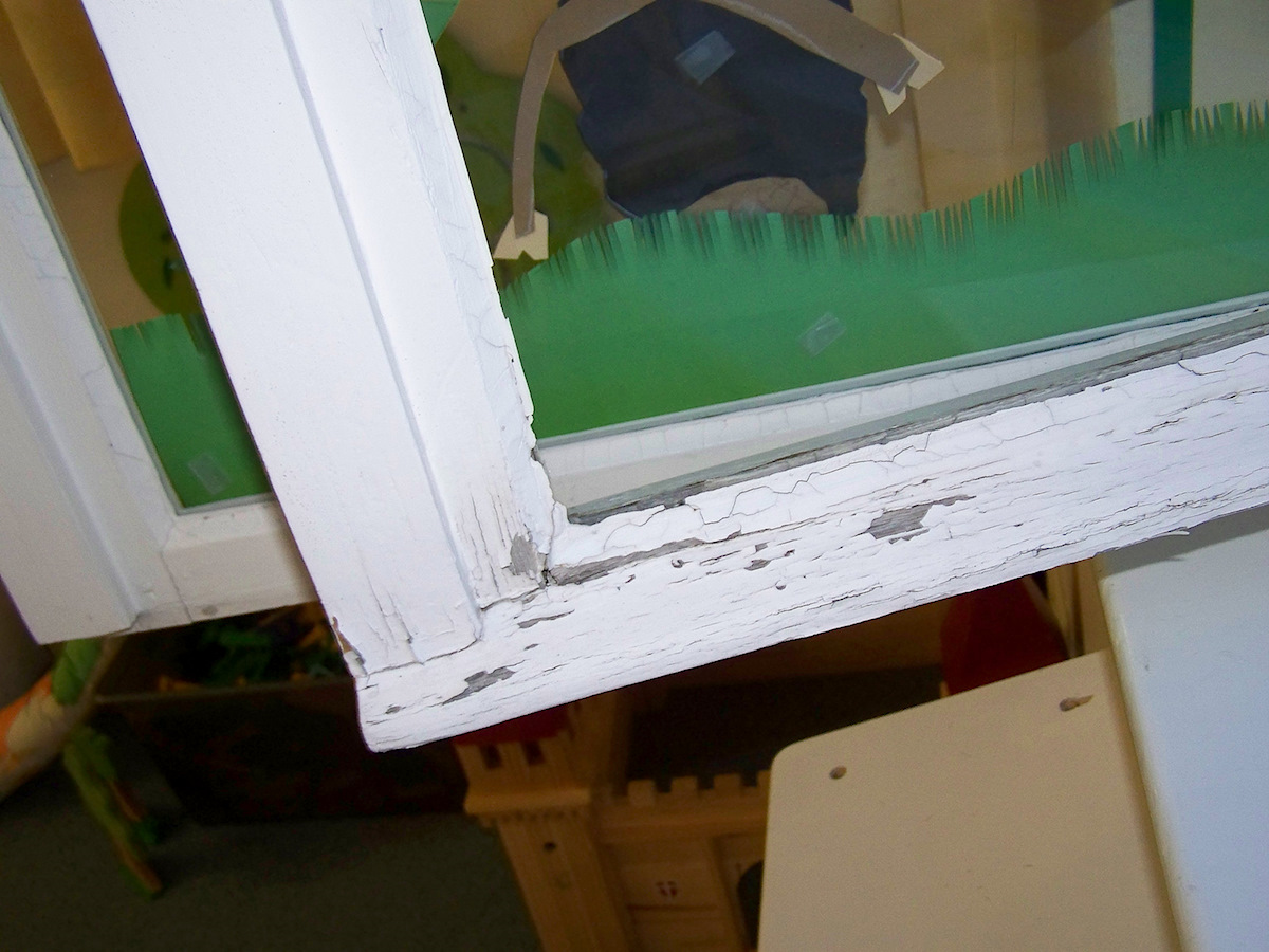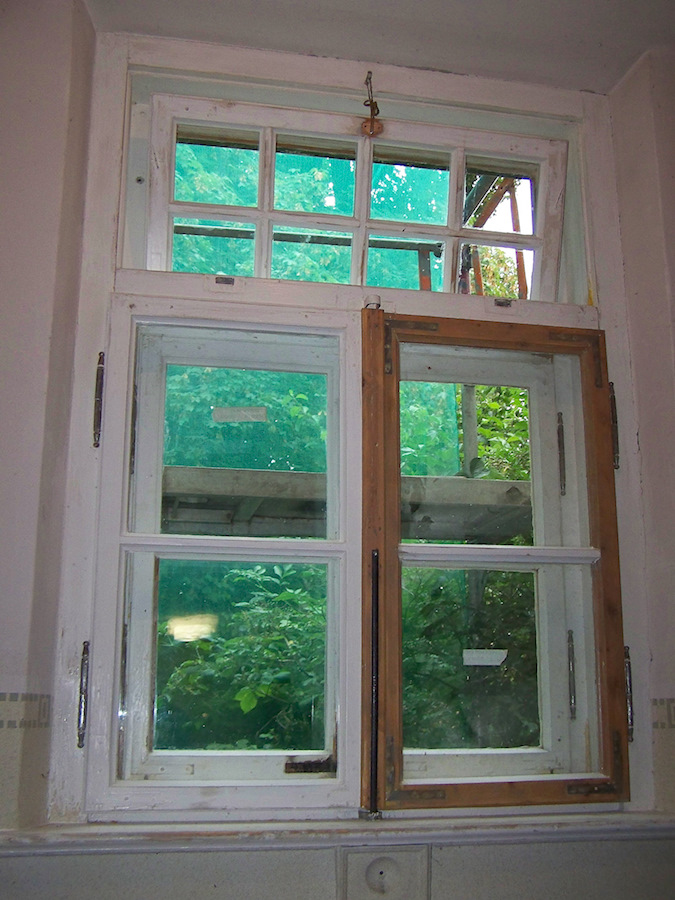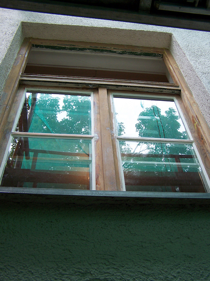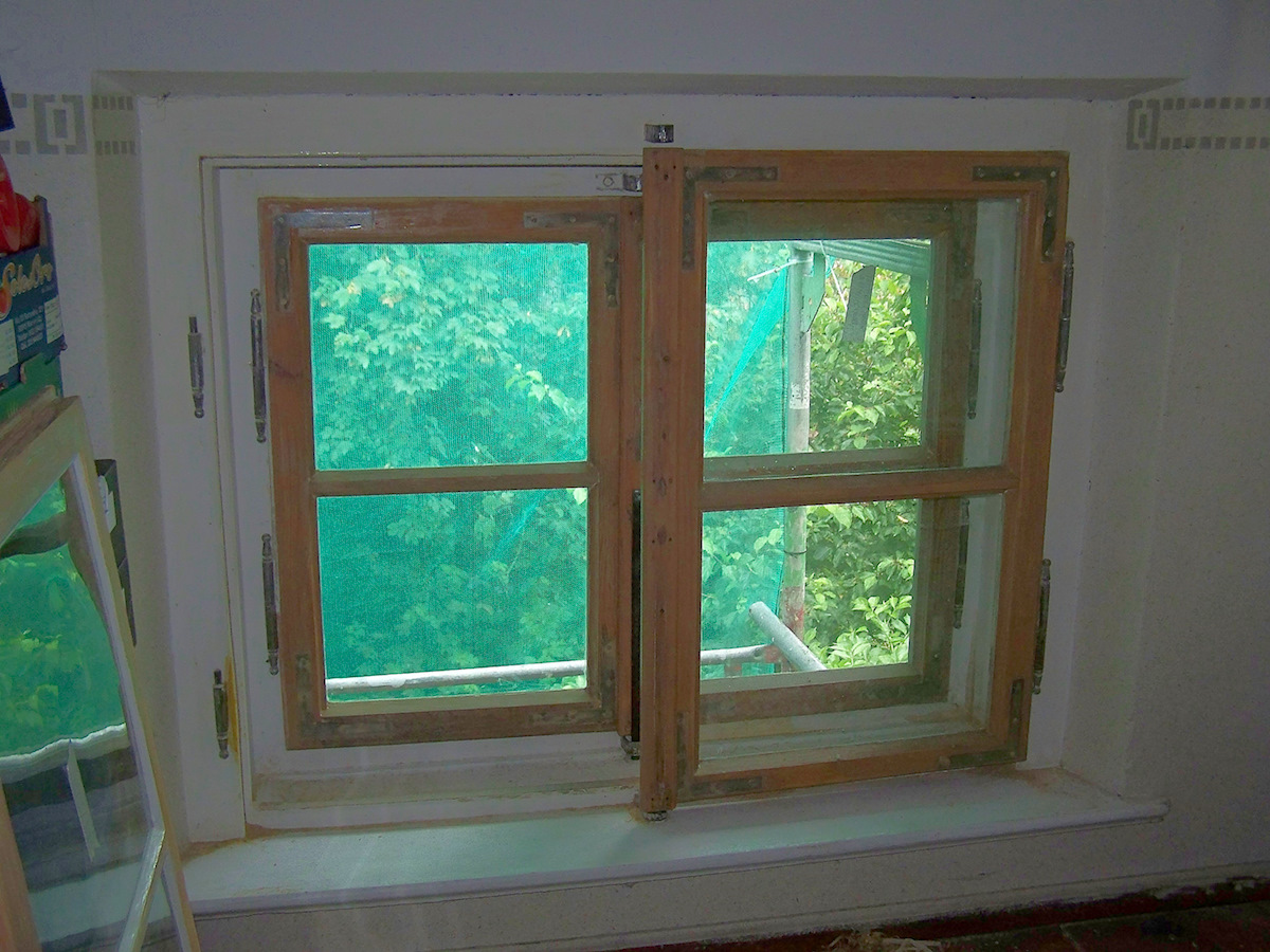 Die Fenster und Stöcke wurden entlackt, bzw. stark angeschliffen. Die Kittfugen außen wurden fachgerecht erneuert und die Gläser außen durch K-Glas ersetzt. Dieser Glasaustausch führt zu einem verbesserten isolierwert des Fensters. Die inneren Scheiben wurden beibehalten, da diese schon bei den Umbaumaßnahmen für den Kindergarten mit VSG Gläsern ersetzt wurden. Alle Beschläge sollten beibehalten werden, daher Wurden diese Ausgebaut, entlackt und schutzoberflächenbehaldelt. Es konnten alle defekten Beschläge wieder gangbar gemacht werden und die fehlenden Beschläge oder Beschlagsteile wurden ersetzt.